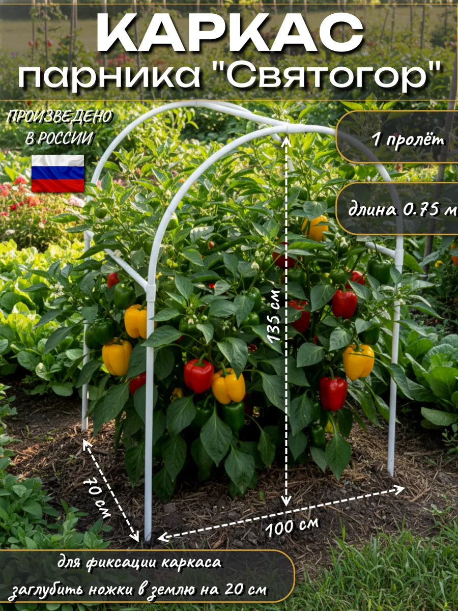 В конструкциях используется жесткая труба ПВХ (диаметр 20 мм), а также соединительные крестовины из высокопрочного пластика, опорные дуги чередуются через 70 см, что придает каркасу достаточную устойчивость.Ширина: 100 см, Высота: 135 см.