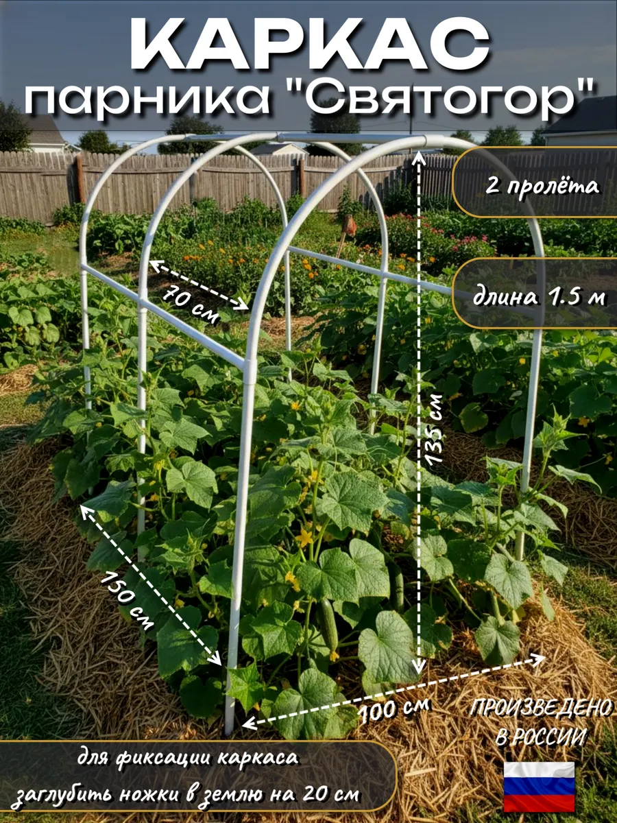 В конструкциях используется жесткая труба ПВХ (диаметр 20 мм), а также соединительные крестовины из высокопрочного пластика, опорные дуги чередуются через 70 см, что придает каркасу достаточную устойчивость.Ширина: 100 см, Высота: 135 см.